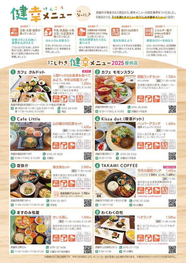 栄養や食材に関する5項目のうち3項目を満たすメニューを「にしわき健幸メニュー」に認定し、市内飲食店で提供します。