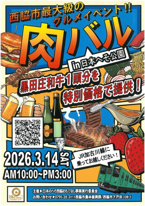 西脇市制20周年記念事業として、黒田庄和牛、日本酒、いちごなどの西脇市が誇る地域食材等をPRする西脇市最大級のグルメイベント『肉バル in 日本へそ公園』を開催します!!